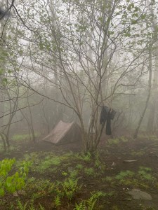 That ZPacks bathtub floor did its job. During the night my sleeping pad slid up against the door and my foot box on the bag was wet. Very wet. Others were worse, all their gear was soaked. Nothing to do but move on and maybe dry things out a little at lunch.