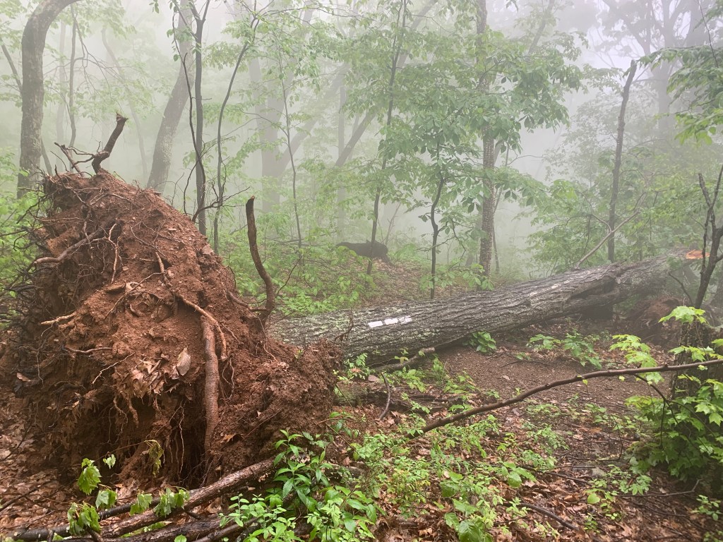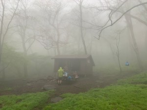 It was an unusual spot because an FAA tower was atop the ridge. It had kind of a weird spaceship look. The Guillotine, a rock formation was just ahead in the trees so I snapped a quick picture and headed for cover. The Guillotine is two large rocks with a third rock sitting squeezed between the two. I took cover underneath and took my pack off to retrieve my rain coat. In the process I hit my head on a rock and felt for blood. I found it. Needless to say I didn’t take a picture but hurried on to the shelter a mile away. The trail was now just a river almost as high as my shoes. The rain slacked off just as I arrived. Jed Morgansen and Tank we’re headed out. Tank a retired policeman from Louisiana and I had lunch at a small stream earlier that day. I asked Tank to inspect the cut on my head. He said it wasn’t too bad so I ignored it. Found Cayenne taking a nap waiting out the storm. Eventually he would decide to spend the night. Later we were joined by Jumanji and Dory, a couple day hiking for a few days. Enjoyed there company and conversation. As bad as the day had been I felt good having covered 31 miles in 3 days despite having to stop early the first day. I planned to go to the next shelter tomorrow for another 12.5 miles.
