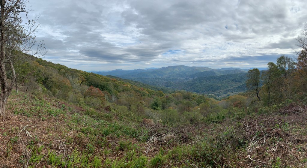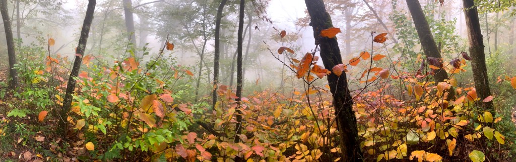 The weather did what it normally does and fooled me this morning. It took a turn for the worse. It got colder and more windy the higher I climbed. Though only a 600 foot climb up Firescald Knob, at 4500 feet it was in the 30’s and winds of around 35 mikes an hour. It wasn’t fog surrounding me but massive clouds blowing across the ridge. Visibility wasn’t more than 50 feet. This wasn’t the hardest climb but the ridge top was rocky and a mile long. Without tree cover I was exposed to the cold and gusting wind. I couldn’t speed walk through this. At times the wind threatened to blow me over. Without the possibility of any views there was no reason to stop moving. It took me almost an hour to cover one mile of the ridge. Yet at some point I began to enjoy the difficulty and the elements. At least it wasn’t raining! Once the trail started off the ridge, within a hundred feet the trees shielded me from the wind and everything got really quiet, even peaceful. It is amazing how being out of the wind changed the experience. Now it was 5 miles down hill to a bed and a shower. Oh yeah and a pizza too! As I walked, the cloud cover grew thinner and the forest lost the gray cast and began to show her colors